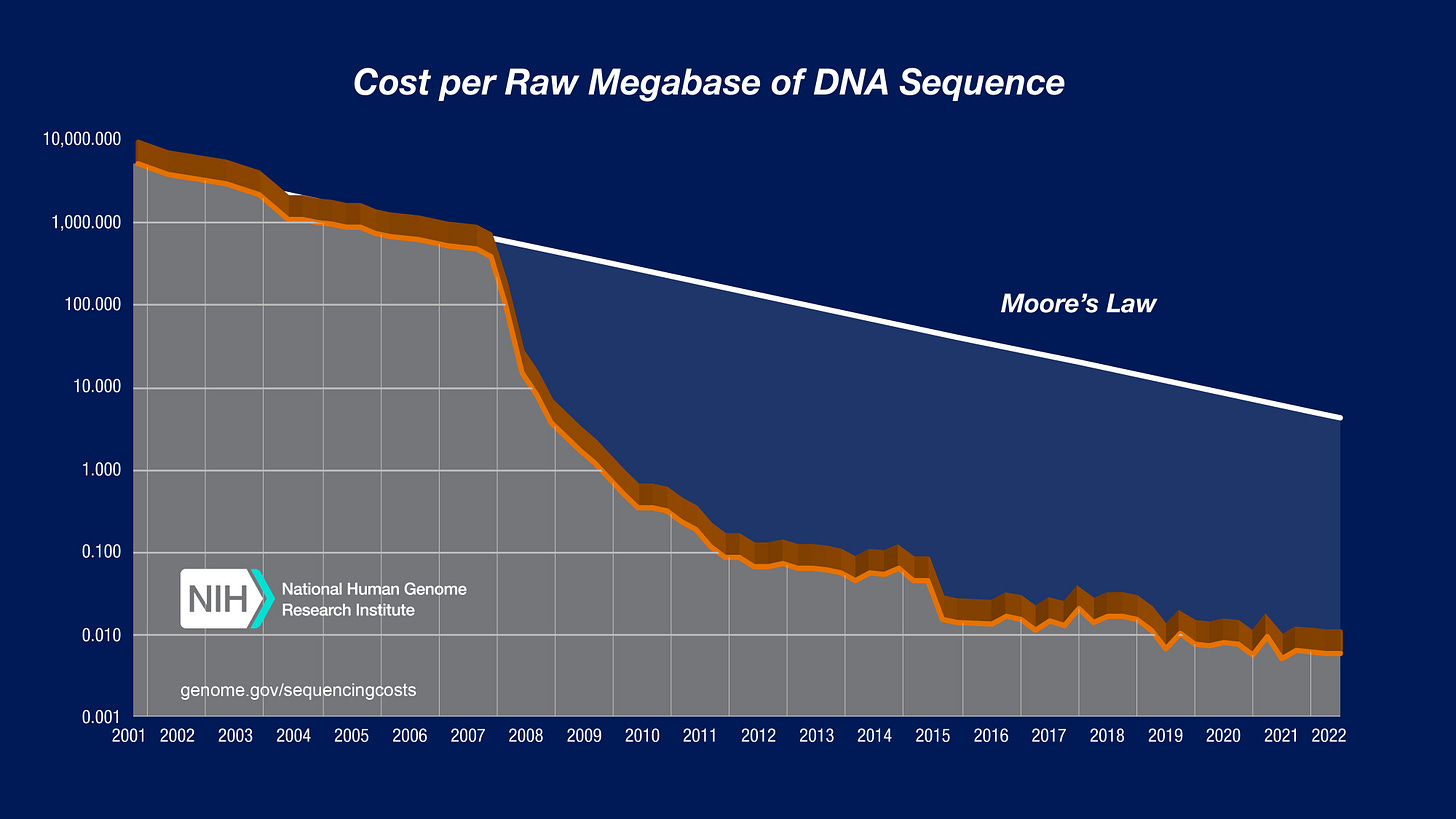 From a business perspective, it is quite helpful to Plasmidsaurus that they are riding one of the most impressive trends in technology over the past 30 years: the decline in sequencing costs. If this trend continues, Plasmidsaurus will be able to continually lower their prices over time and induce more demand from customers.