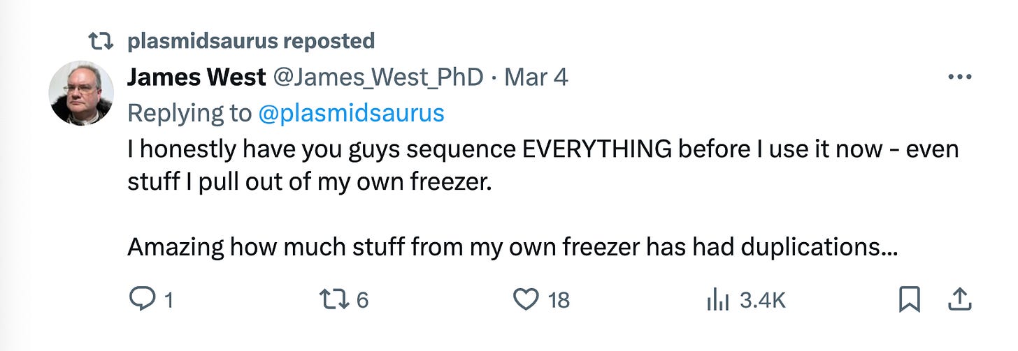 Oh, and we should talk about prices. Plasmidsaurus will sequence your sample for $15. Fifteen bucks! Prices like these are simply unheard of for biotech services. To call this affordable is an absurd understatement – you would be foolish not to use this service liberally, because it can avoid costly mistakes. This is mission-critical information, at a price that is low for me, running an independent two-man lab. For a big academic or industry lab, it’s a rounding error.